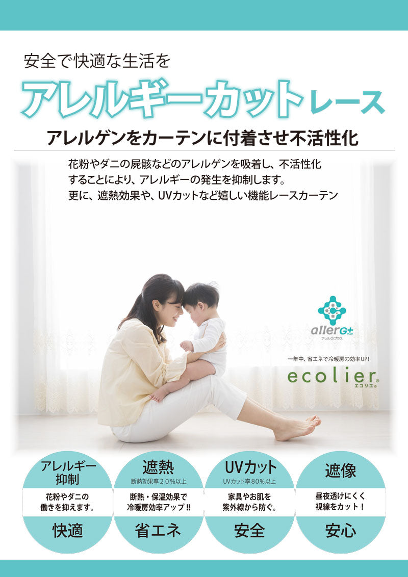 - 花粉やダニの屍骸などのアレルゲンを吸着し、不活性化することにより、アレルギーの発生を抑制します。さらに、遮熱効果やUVカットなど嬉しい機能性レースカーテンです。