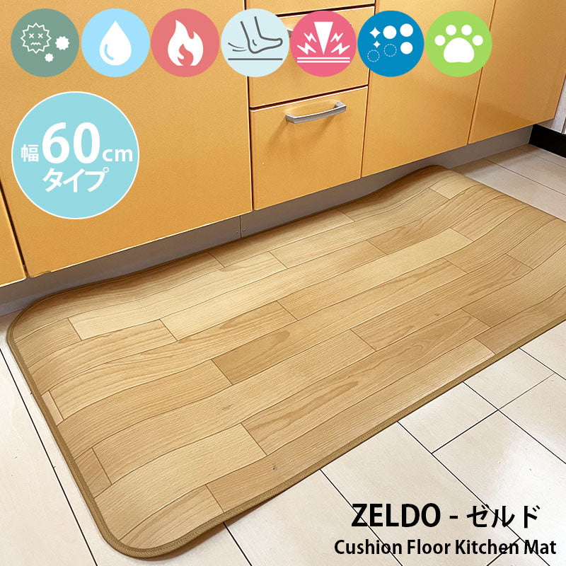匂いを軽減して傷つきにくい表面強化タイプ!汚れても拭き取るだけでキレイ!はっ水・抗菌・防炎機能付きキッチンマット幅60cmタイプ<Zeldo - ゼルド>