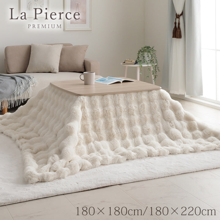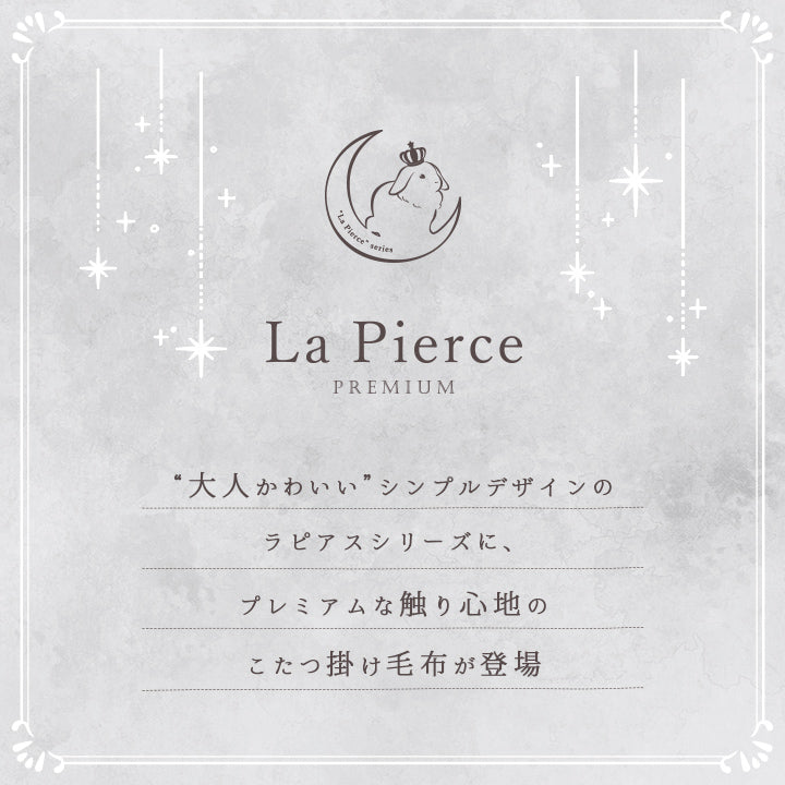 大人かわいい"シンプルデザインのラピアスシリーズに、プレミアムな触り心地のこたつ掛毛布が登場。 もこもことしたシルエットが可愛い、ラビットファー調のこたつ掛け毛布です。 当商品の生地を選定するにあたり、担当者が数種類の生地を実際に触り比べ、プレミアムの名に相応しい触り心地の生地を追及しました。 極細のフィラメント糸で、とろけるような触り心地です。 毛足の長さは25mmを採用しているので、一般的な毛布よりもふわふわの極上タッチをお楽しみいただけます。 表面はシリーズの中でも高目付です。ボリュームアップしたことでより贅沢な触り心地と、暖かさを実現しました。 中綿なしでも生地に重みがあり、暖かいのでブランケットとしてもお使いいただけます。 小さなお子様がいるご家庭でも安心な乳幼児基準値をクリア。お子様にも安心の低ホルムアルデヒド商品です。 キルトなしの2枚合わせこたつ掛け毛布なので、もこもこのデザインを崩さず可愛さをキープ。 裏面にはなめらかな肌触りのフランネル生地を使用しています。 自宅で手軽に洗濯ができるので、清潔さとふわふわのボリューム感をキープできます。 優れた技術と整備された施設で、徹底的な管理体制の元生産された安心の品質です。 オフシーズンには毛布をしまっておけるケース付きで、収納も困りません。