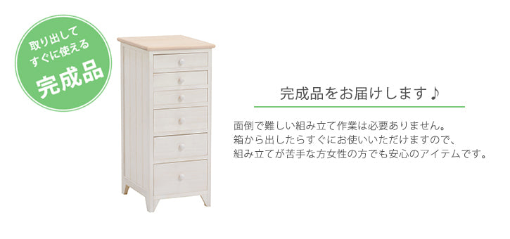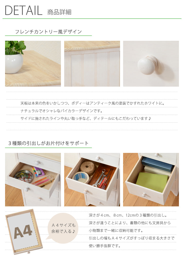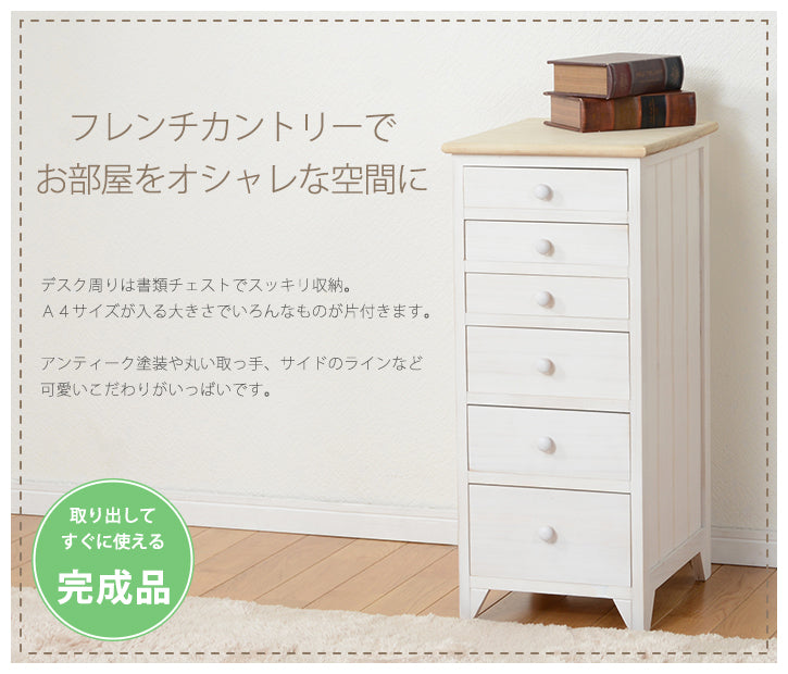 - シャビーホワイトの本体にアンティーク調ナチュラルな天板が映える、シンプルチェスト。