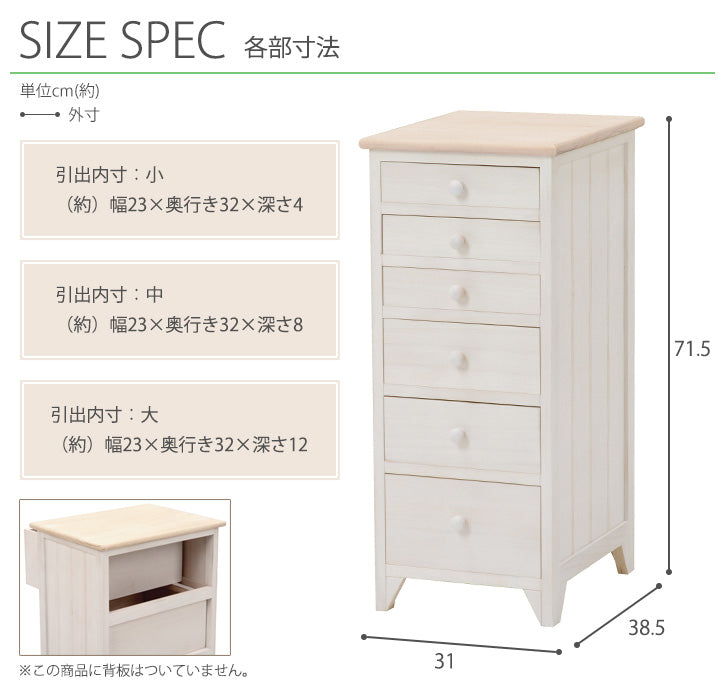 シャビーホワイトの本体にアンティーク調ナチュラルな天板が映える、シンプルチェスト ホワイト(約)幅31×奥行38.5×高さ71.5cm