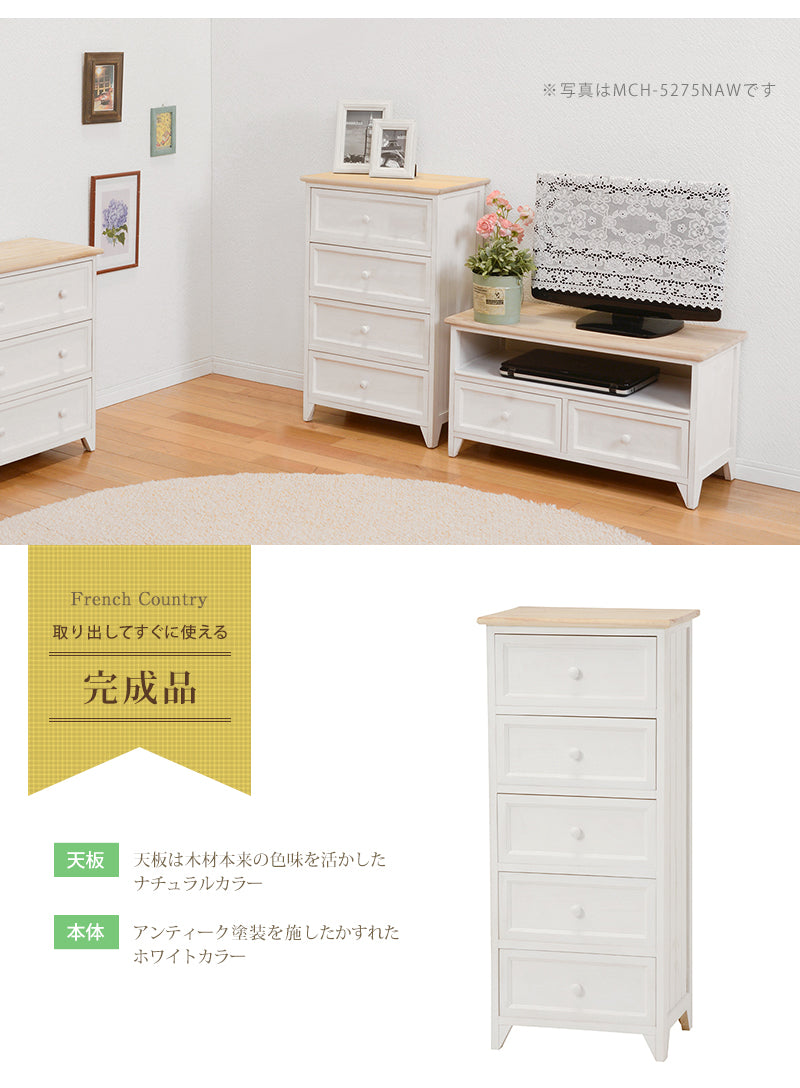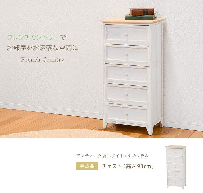 - シャビーホワイトの本体にアンティーク調ナチュラルな天板が映える、シンプルチェスト。