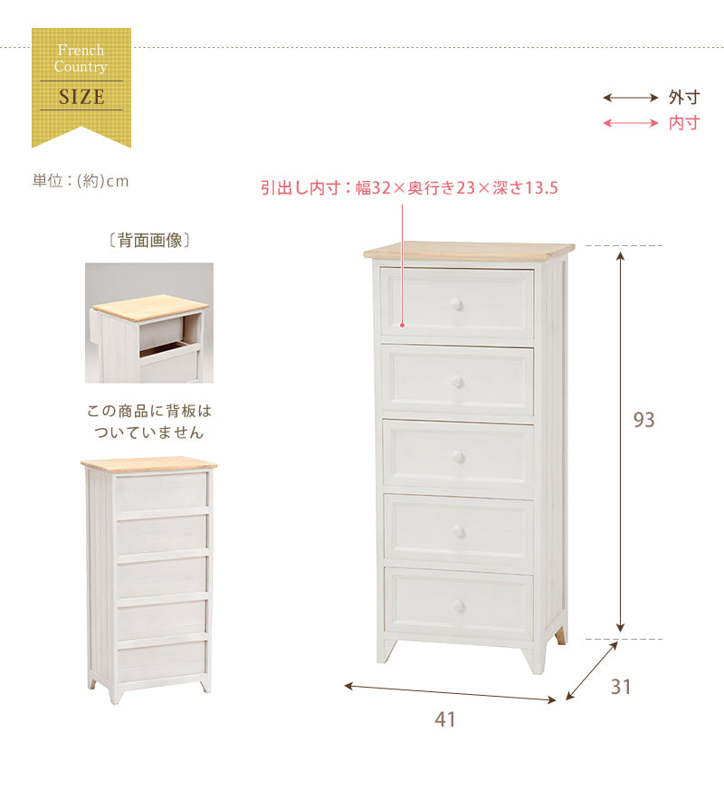 シャビーホワイトの本体にアンティーク調ナチュラルな天板が映える、シンプルチェスト ホワイト(約)幅41×奥行31×高さ93cm