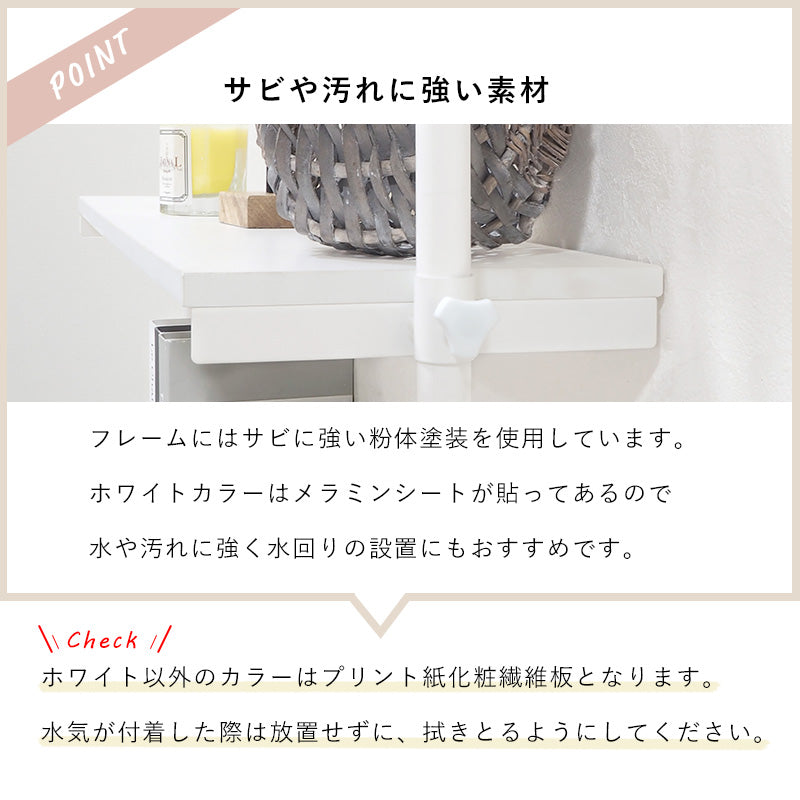 - フレーム:スチール、棚板:<ブラウン/ブラック>プリント紙化粧繊維板、<ナチュラル/ホワイト>プリント紙化粧繊維板、<ホワイト/ホワイト>メラミン樹脂化粧繊維板