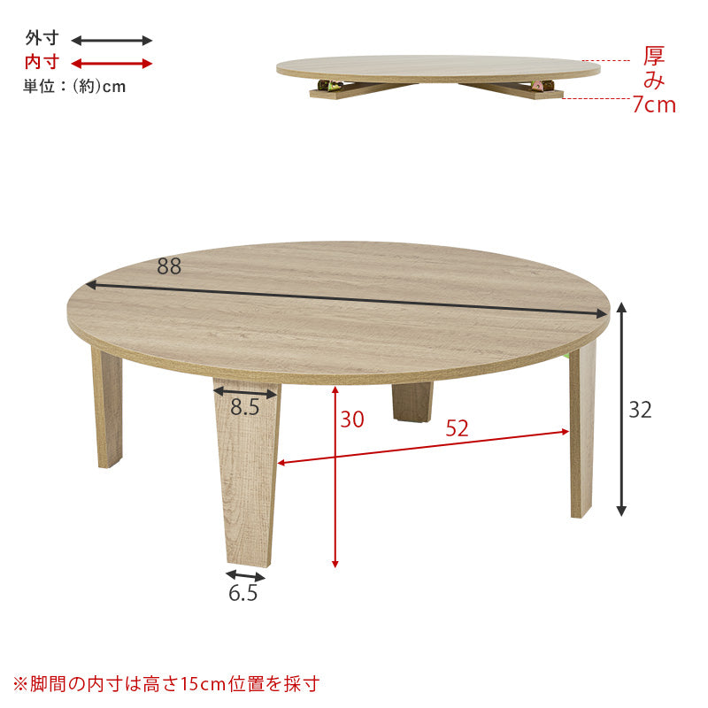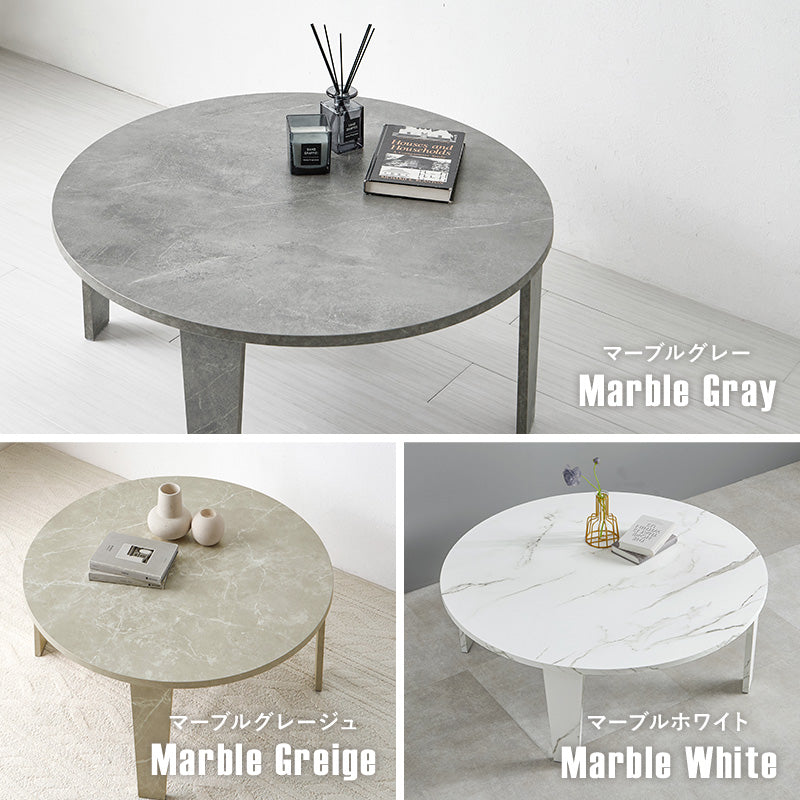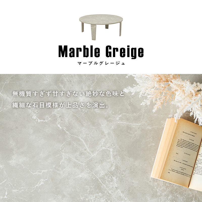 - 風合いの再現にこだわった円形テーブル。ヴィンテージの味わいがある木目調とモダンな印象の石目調から選べます。折りたたみ機能付き。