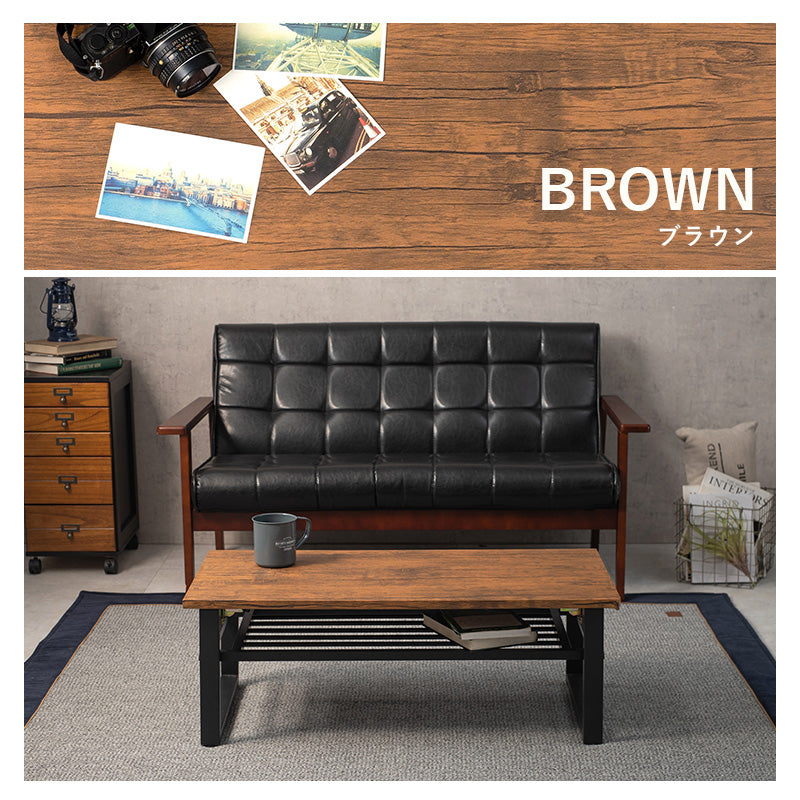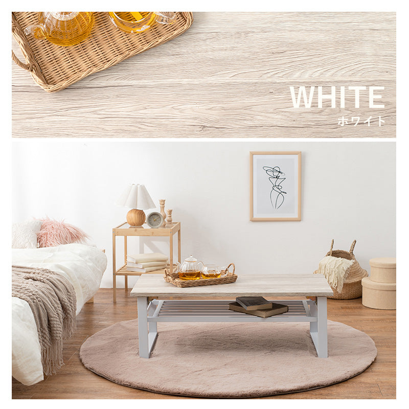 - 天然木の素材感を再現した棚付きセンターテーブル。隙間に収納しやすい折りたたみ式