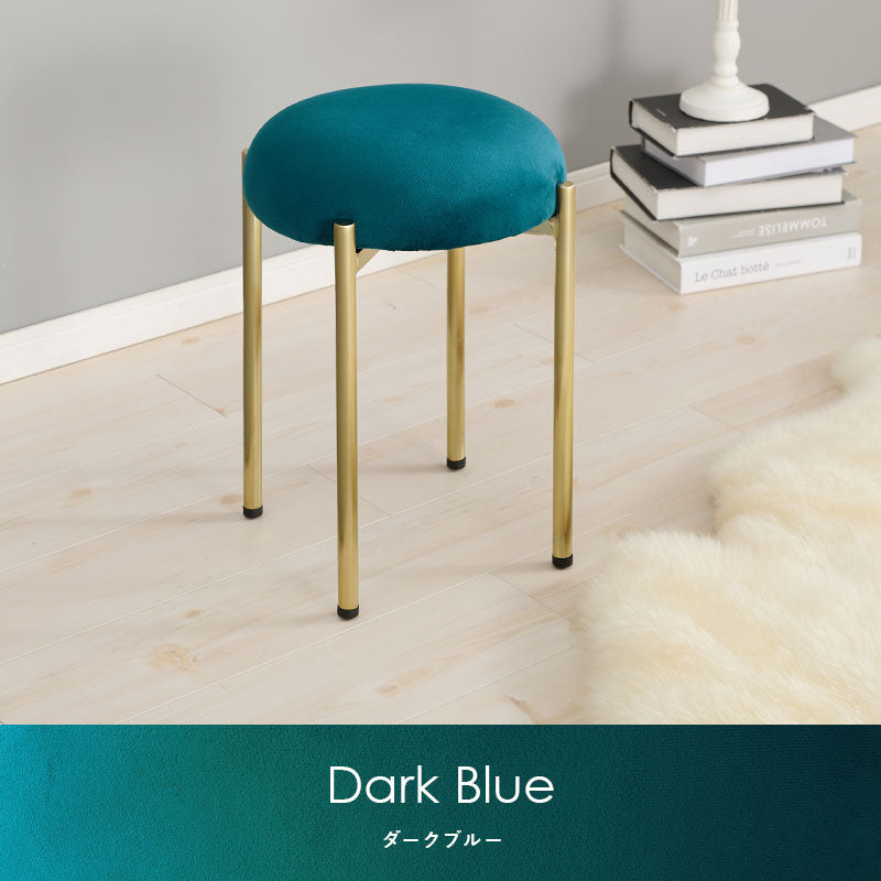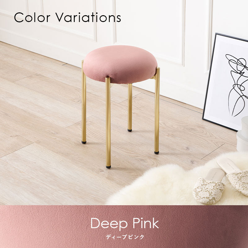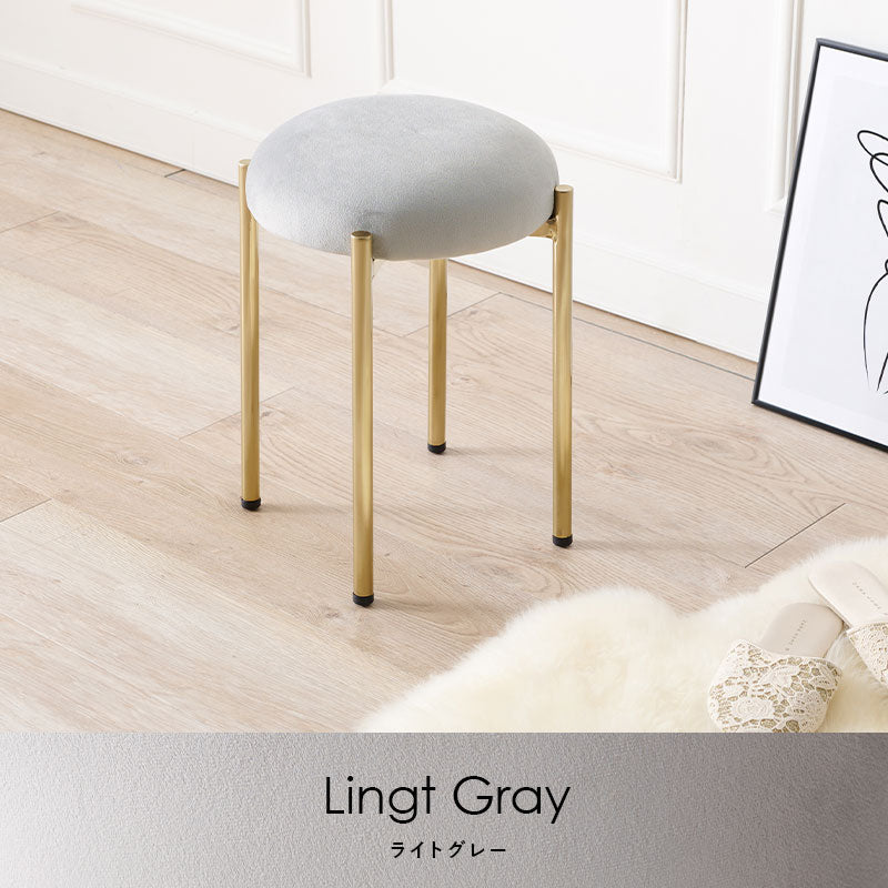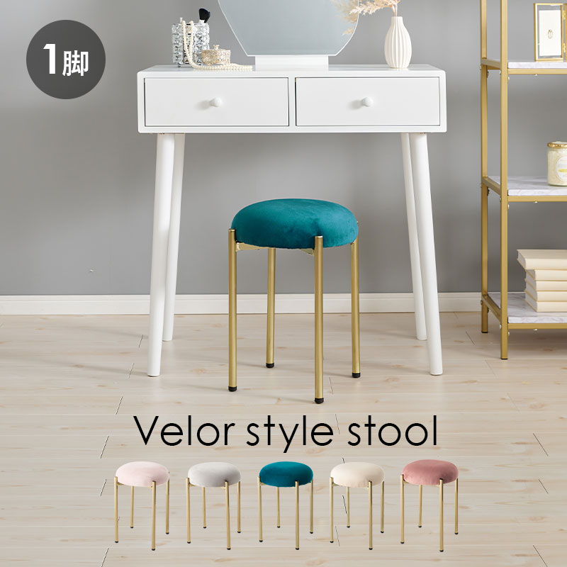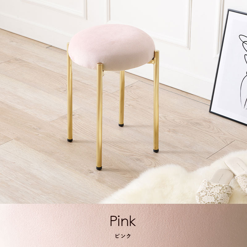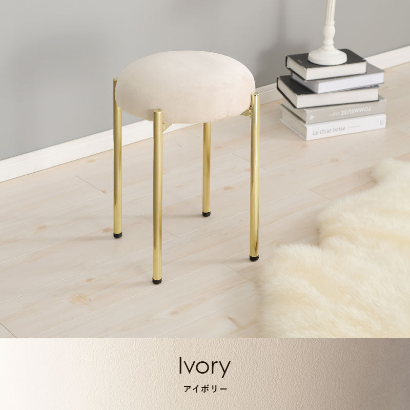 - ころんとした座面にゴールドの脚がフェミニンなスツール。なめらかな触り心地のベロア風生地を使用しています。