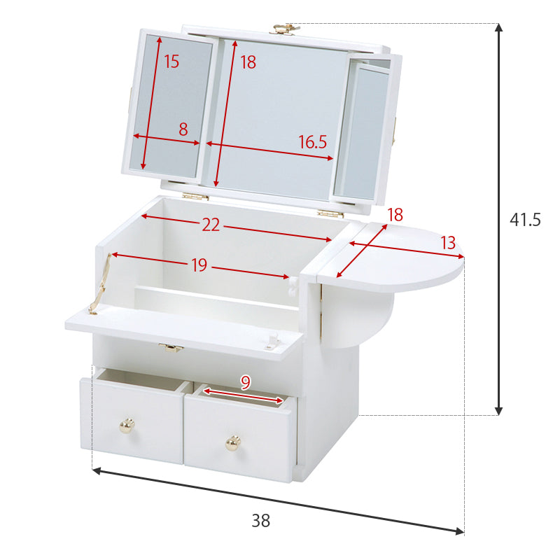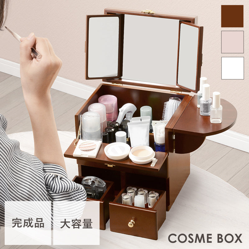 - 三面鏡がついた大容量のコスメボックス。サイドにバタフライ式のミニテーブルも付いています