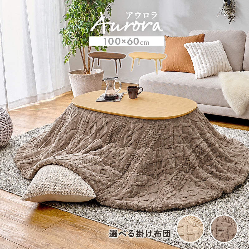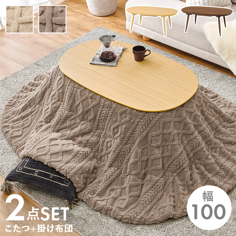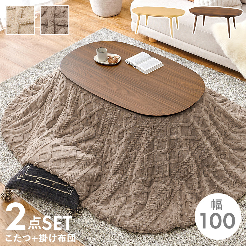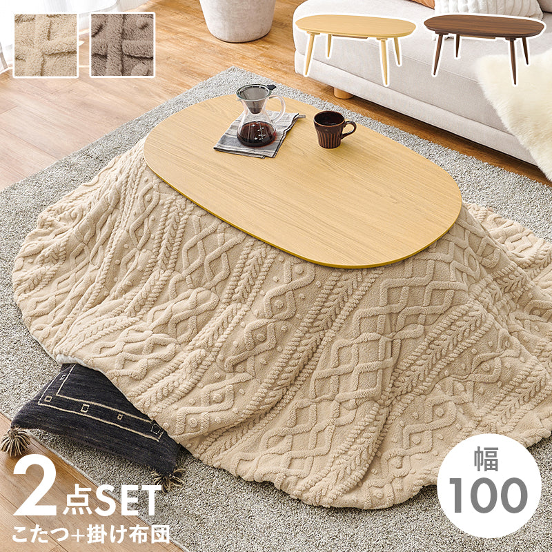 丸みが美しいオーバル型の天板にシャープな脚を合わせたこたつテーブルと立体感のあるこたつテーブルとセーターのような立体的なデザインがおしゃれな掛け布団2点セット 本体巾100cm