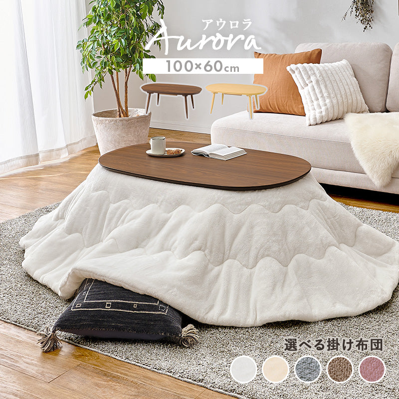 - あたたかみのある木目調のナチュラルデザイン。丸みが美しいオーバル型の天板にシャープな脚を合わせたこたつテーブルととろけるような肌触りのシンプルな掛け布団セット