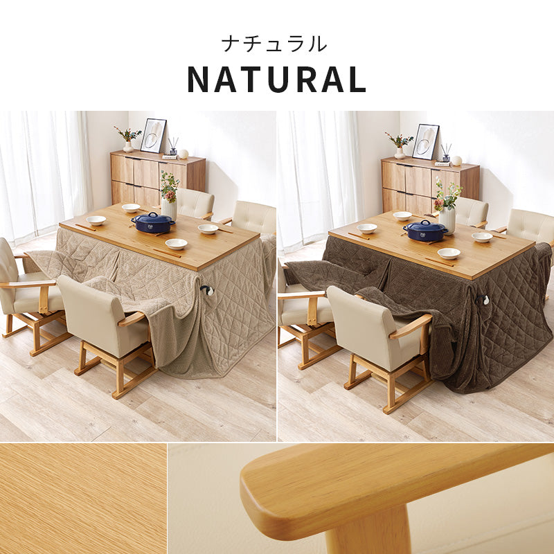- こたつ:<天板>天然木化粧繊維板・UV塗装<脚部>ラバーウッド、ヒーター:MHU-601E(D) 600Wハロゲンヒーター(手元コントローラー付)、ふとん:< 側地><中材>ポリエステル100%、チェア:<木部>ラバーウッド<張地>合成皮革