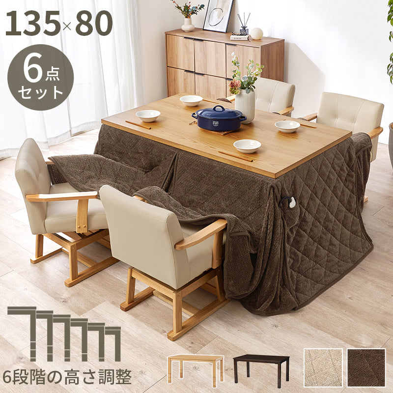 ダイニングコタツ6点セット テーブルの高さを6段階に変更 こたつ布団セット 135×80cm こたつ椅子 4脚 ダイニングこたつ