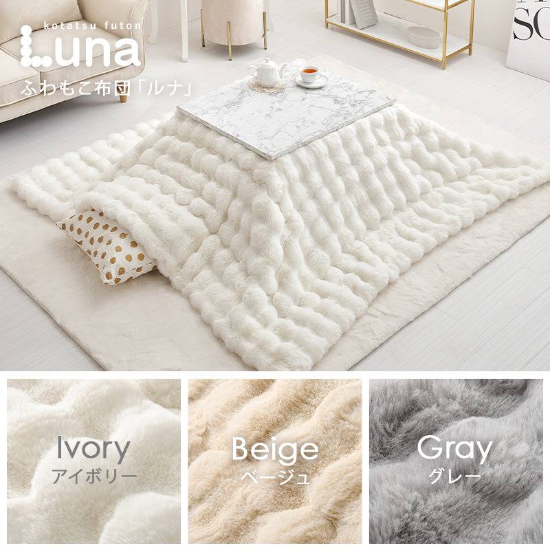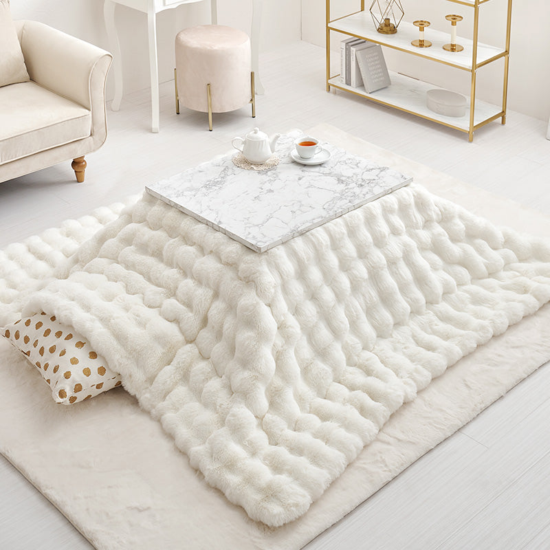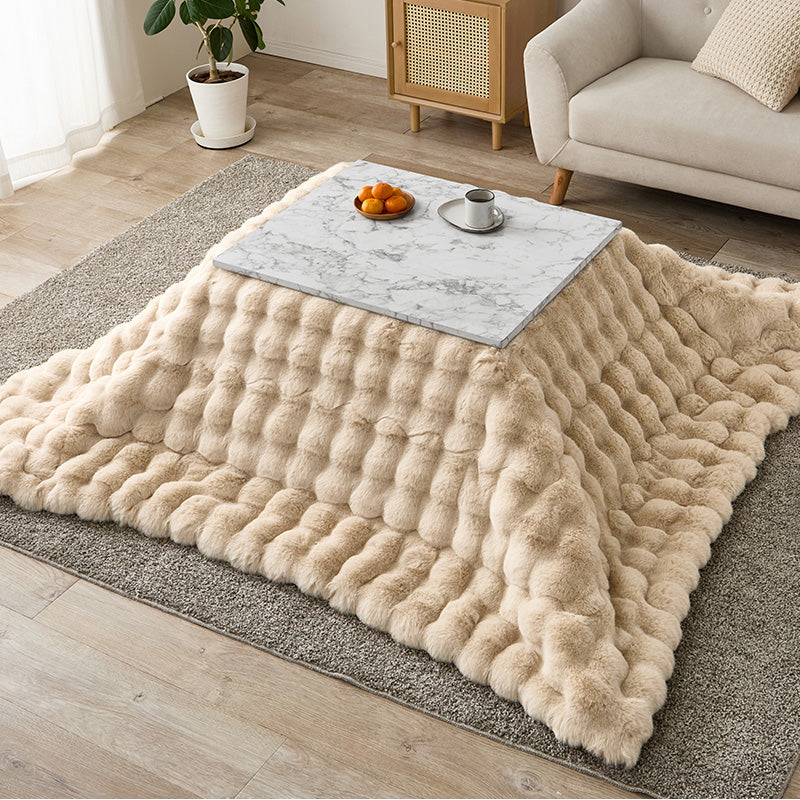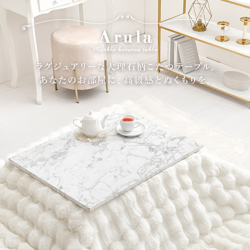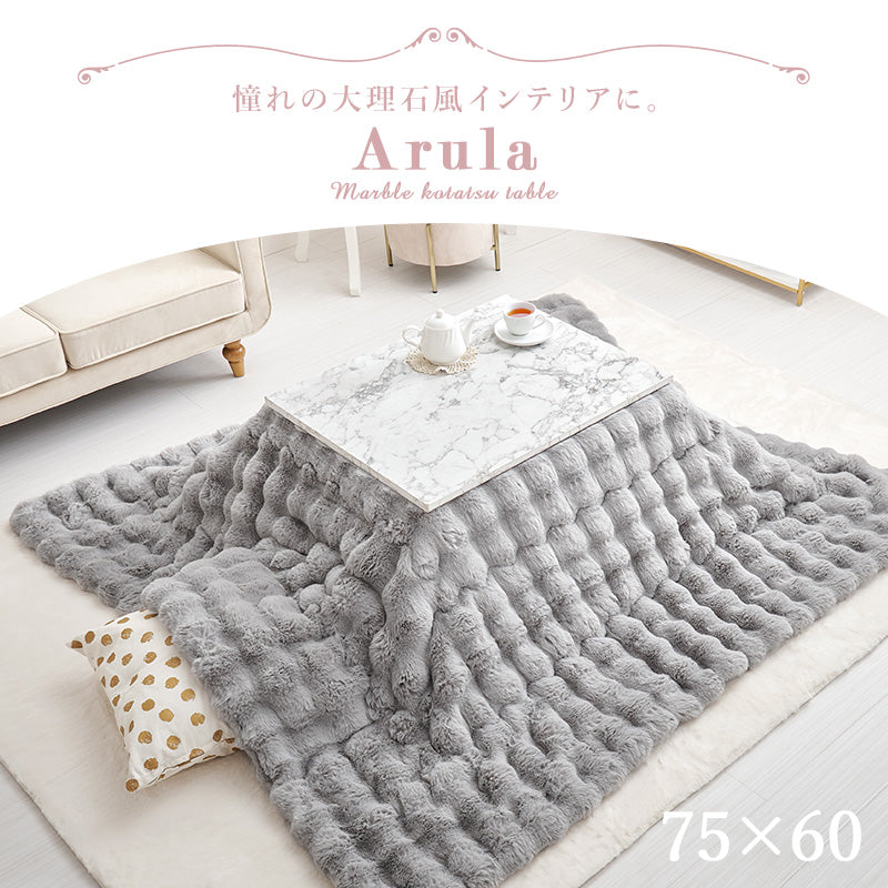- おしゃれで可愛い大理石柄のこたつテーブル。コンパクトでひとり暮らしのお部屋でも置きやすいサイズです。ラビットファーのような、ふわもこの掛け布団セット