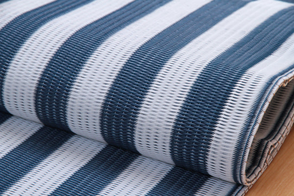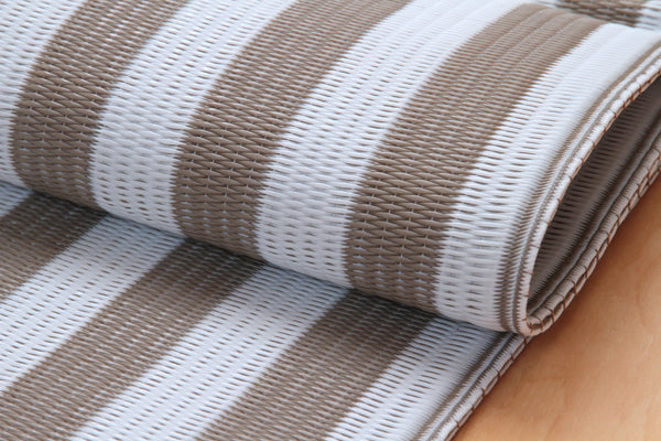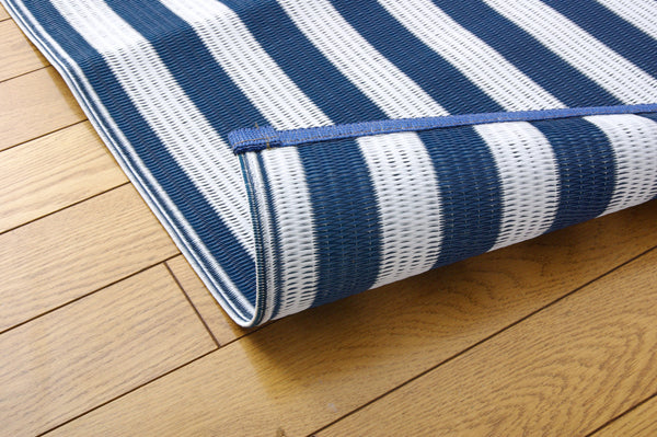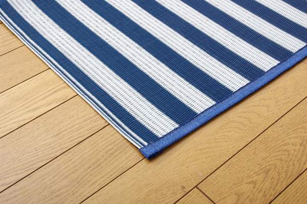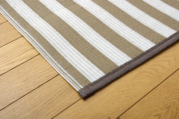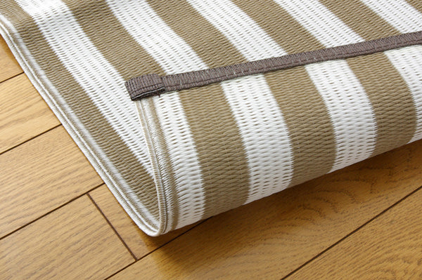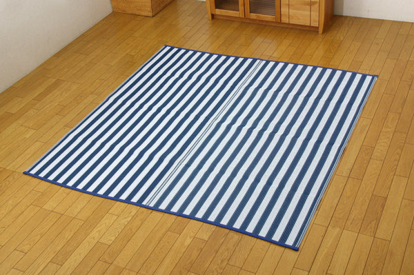 - ■シンプルなボーダー柄のポリプロピレンを使用したラグです。ポリプロピレン素材を細いパイプ状にして織りこんだ敷物です。強度が高くしっかりとしています。室内用のラグとしてはもちろん、レジャーシートとしてもご使用いただけます。ほこりが出にくく汚れも拭きとりやすいためお手入れも簡単です。肌触りはさらさらとしております。ご使用されないときには折りたたんで収納できます。