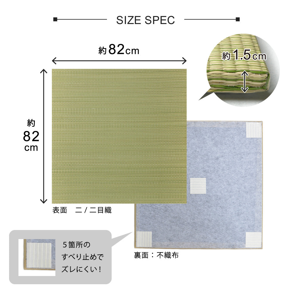 - 床に並べるだけで簡単に畳のスペ-スが作れる「置き畳」です。軽量なので女性1人でも取り扱いがラクラク。ちょっとした隙間スペ-スを有効活用できるのでキッズ向けのプレイマットからシニアのお昼寝、お父さんお母さんのごろ寝スペ-スまで簡単に作れます。適度なクッション性があり、階下への配慮や床のキズ防止など、子育て中にもうれしい便利グッズ。天然い草を使用し、等間隔な織り方でサラッとなめらかな手触り。い草の空気清浄や湿度調整機能で年中快適です。