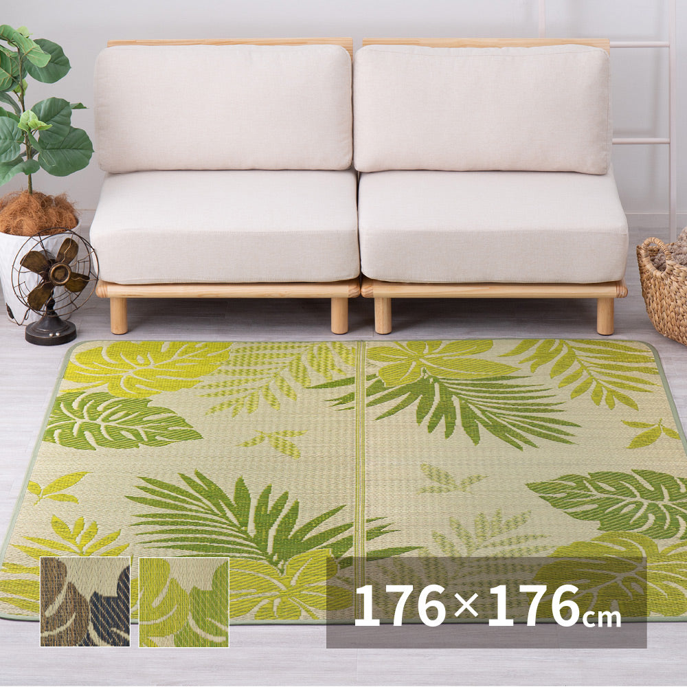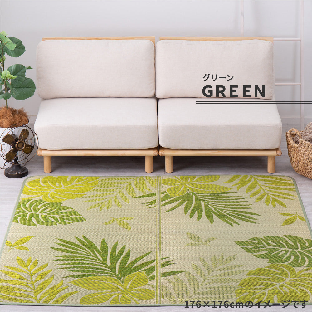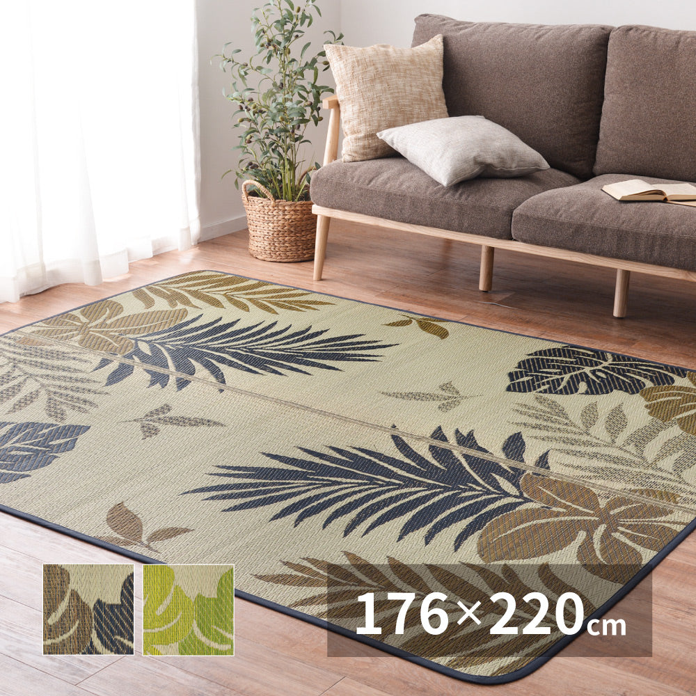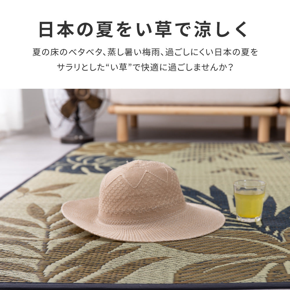 モンステラなどのリーフ柄が涼しげなリゾート気分のい草ラグ リゾート
