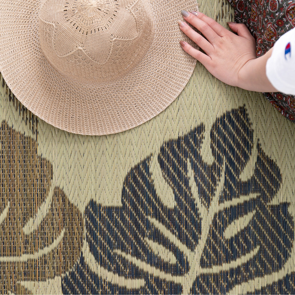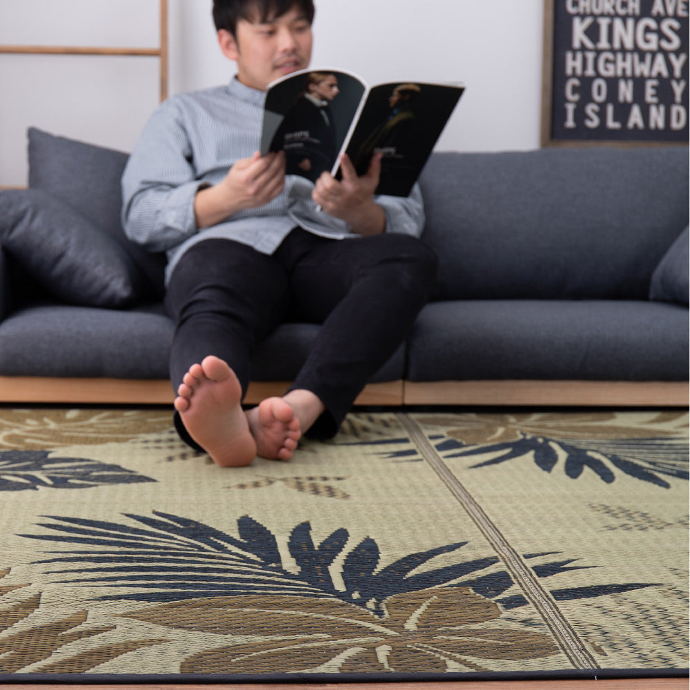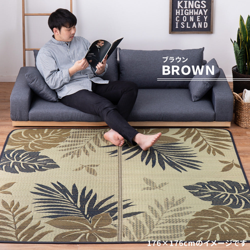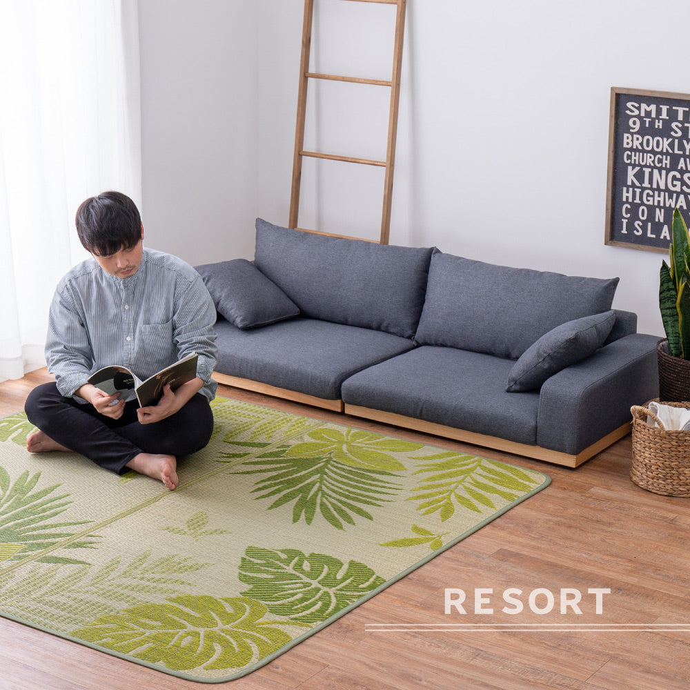 - モンステラなどのリーフ柄が涼しげなリゾート気分のい草ラグ。い草がもつ湿度調整機能でサラリと爽やかな肌触りは、暑い季節を快適に過ごすには最適なアイテムです。裏面は、不織布で床を傷つけにくくなっています。