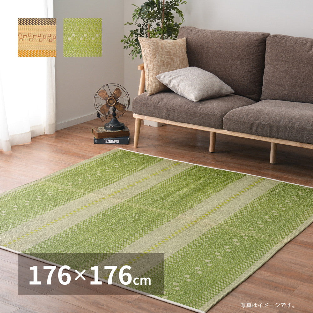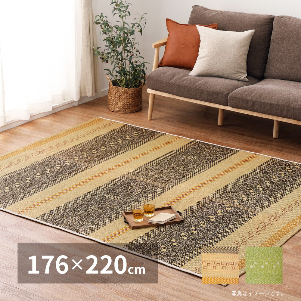 - ギャッベ風柄をい草ラグに。ナチュラルなカラーリングの大きめボーダー柄で、洋室にも取り入れやすいデザインに。い草がもつ湿度調整機能でサラリと爽やかな肌触りは、暑い季節を快適に過ごすには最適なアイテムです。裏面は、不織布で床を傷つけにくくなっています。