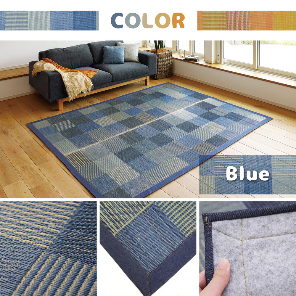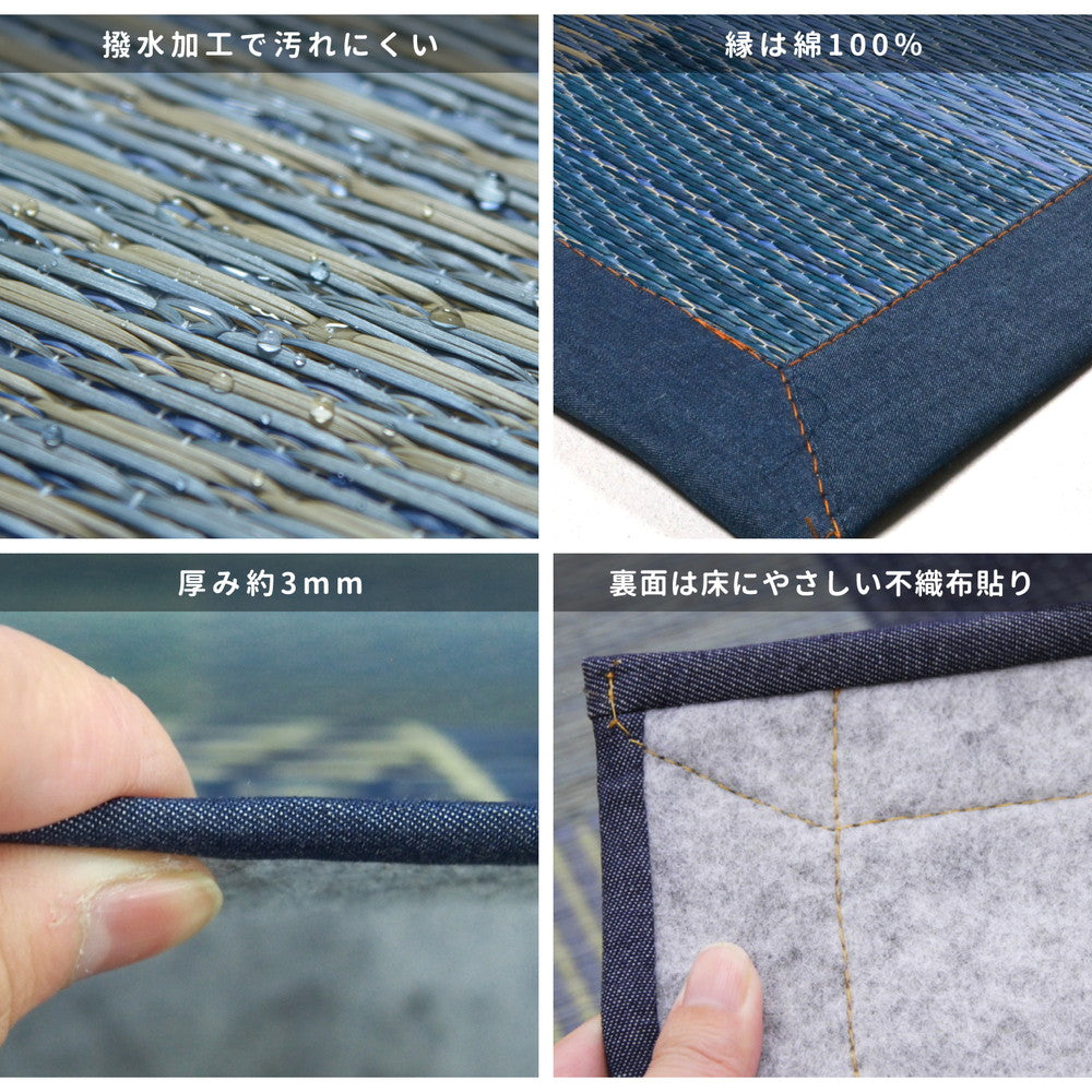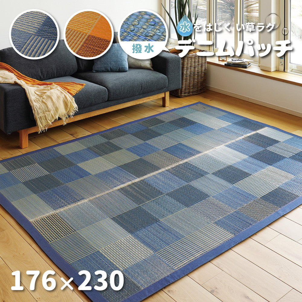 - 天然のい草を使用した快適ラグ! デニムのパッチワークのような柄で、和洋のテイストを問わず使いやすいデザイン。 い草は消臭、調湿機能もある優れた素材です。 撥水加工つきなので、子どもやペットのいる家庭にもおすすめ。時間がたつとしみこんでしまうので、こぼれた場合はすぐにふき取って下さい。 裏面は床を傷つけにくい不織布貼りです。