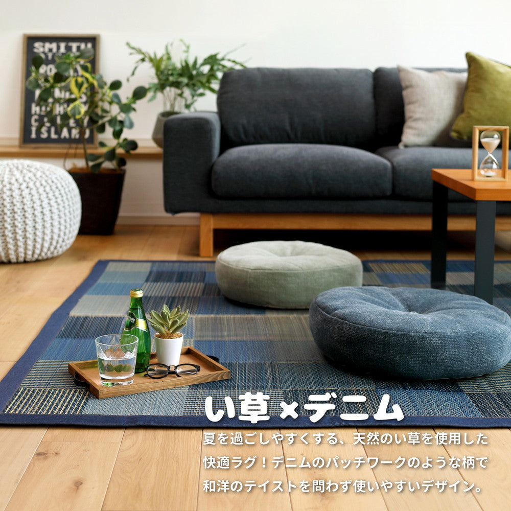 デニムのパッチワークのような柄でをはじくい草ラグ デニムパッチ