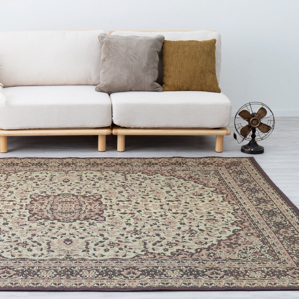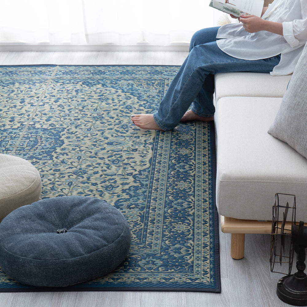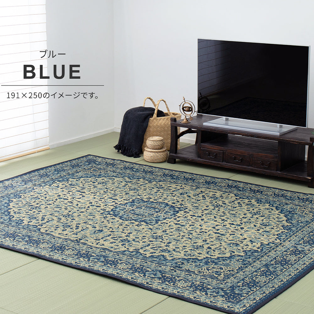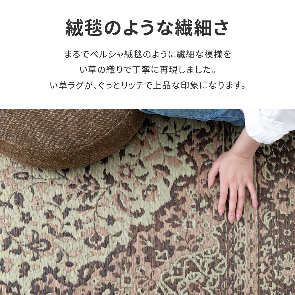 - 三重織により厚みを確保し、ペルシャ絨毯のような細やかな柄をデザインしたい草ラグ。お部屋をモダンに演出したい方にもおすすめです。い草は、湿度の高いときは湿気を吸収し、乾燥した際には蓄えた水分を放出する機能があり汗ばむ季節に最適。さらりとした踏み心地で、からだも気分も涼しくお過ごしいただけます。裏面は、不織布加工で床を傷つけにくくなっています。