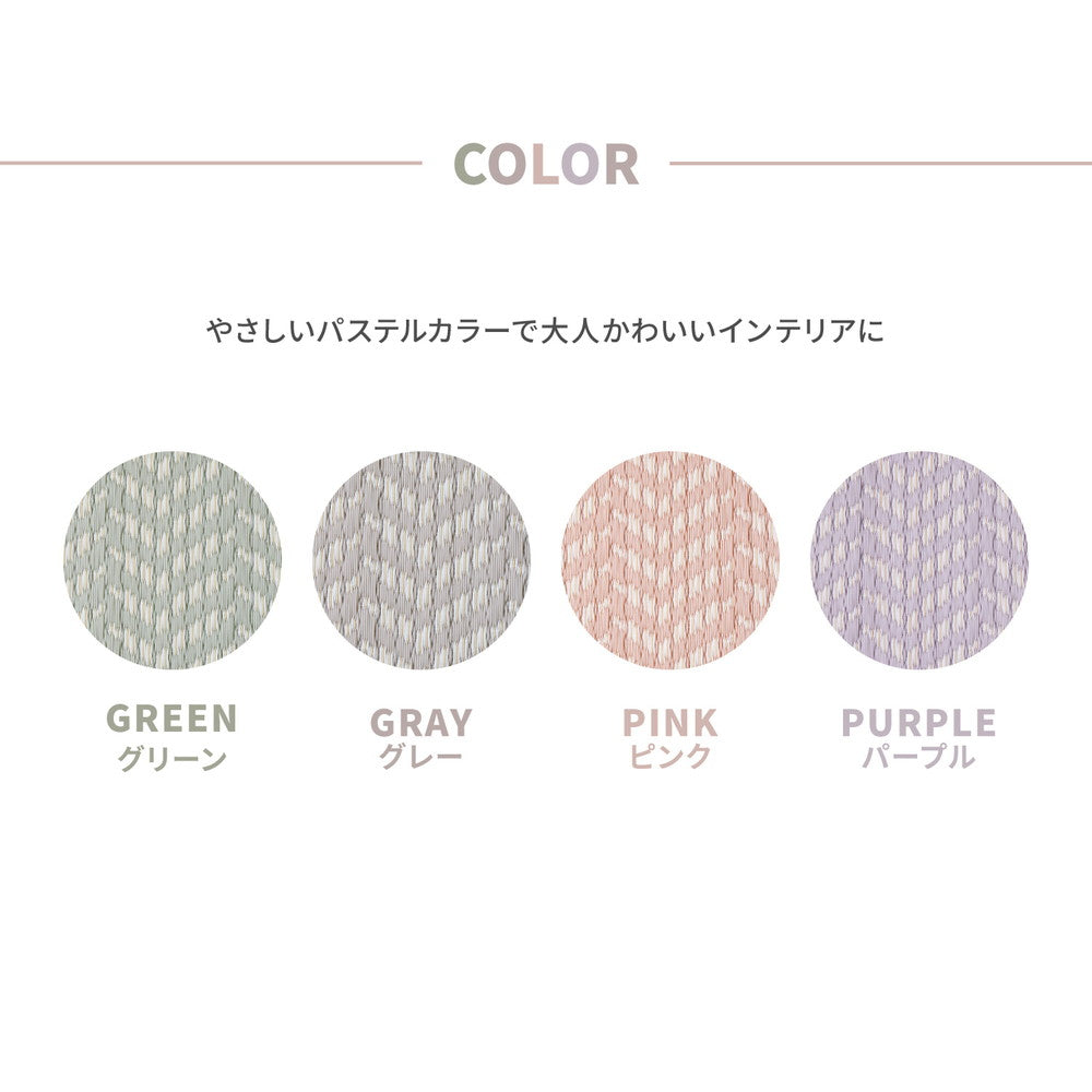 - パステルカラーがかわいい、水洗い出来るPP素材のい草風カーペット。パイプの表面に筋が入っている筋入りパイプで、肌に密着しないからベタベタしにくく、汗ばむ季節にもおすすめ。また、パイプ内の空気層の保温効果で床からの冷気を防ぐため、寒い季節でもあたたかく過ごせます。