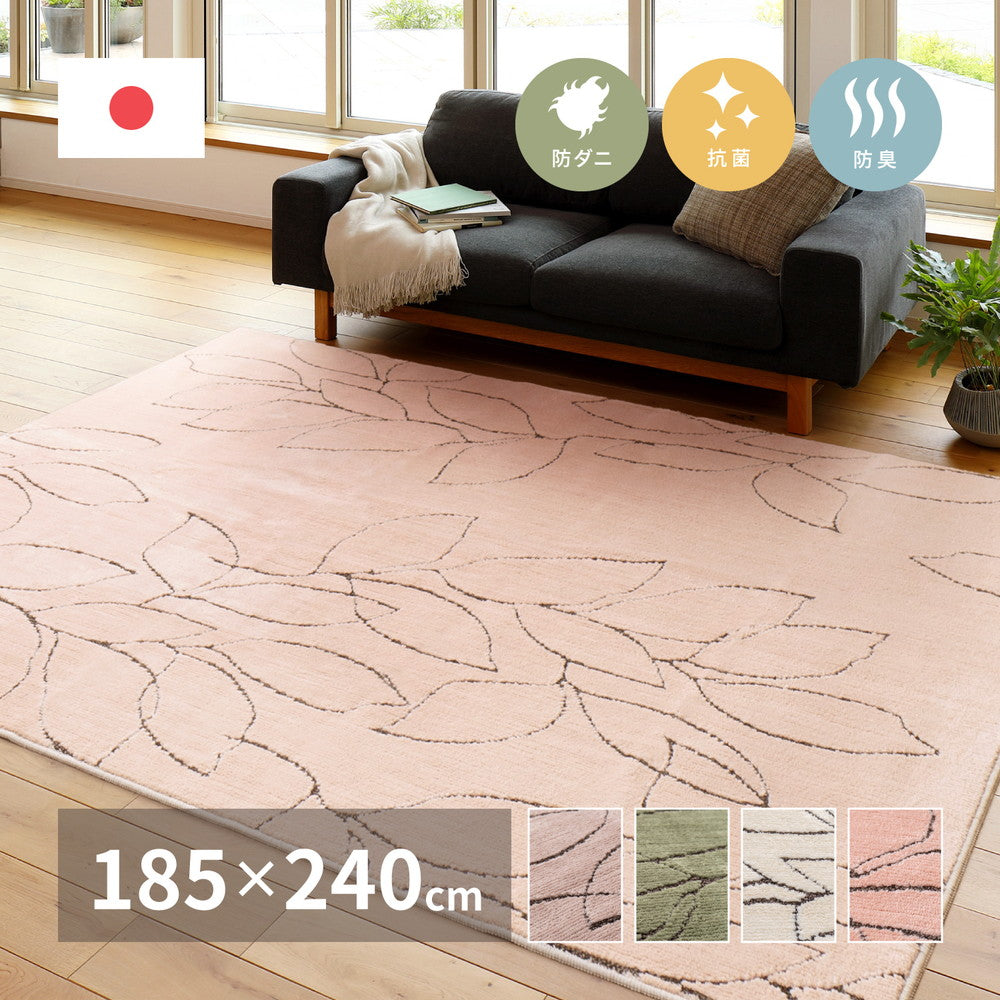 - ふんわりとやさしいマシュマロタッチ。淡い色合いと、葉っぱのデザインがやわらかな印象のラグです。防ダニ・抗菌防臭機能付きで家族が安心してくつろげる空間に。ホットカーペット・床暖房対応でオールシーズン快適にお使いいただけます。