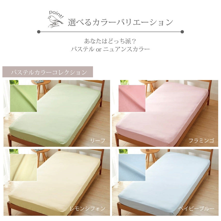 - 肌触りの良い日本製の綿100%の生地を使用したベッドウェアです。 シーツはゴム式ですのでお一人で簡単に掛けやすく、どんなお布団やお部屋にも合うお色味をご用意!