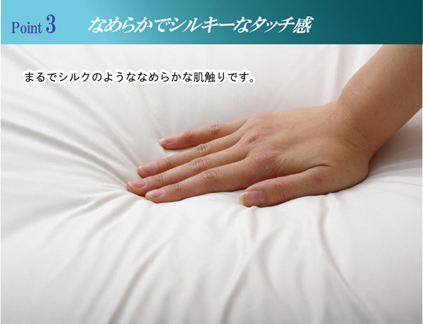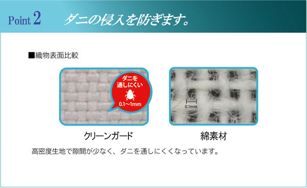 ■生地にマイガードを使用しています。マイガードは繊維と繊維の隙間が少ない高密度生地なので、ほこりの原因となる糸切れ、毛羽立ち、中綿の吹き出しを防ぎハウスダストを大幅に低減します。またダニの侵入を防ぎ、クリーンで快適な睡眠をサポートします。