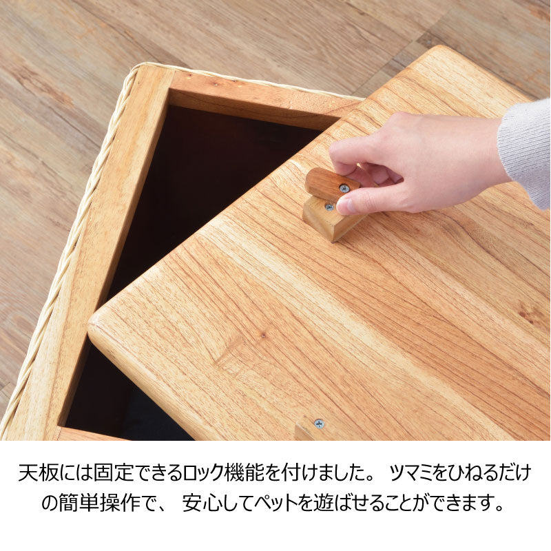 ■天板には固定できるロック機能を付けました。ツマミをひねるだけの簡単操作で、安心してペットを遊ばせることができます。