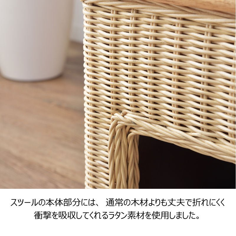 ■スツールの本体部分には、通常の木材よりも丈夫で折れにくく衝撃を吸収してくれるラタン素材を使用しました。
