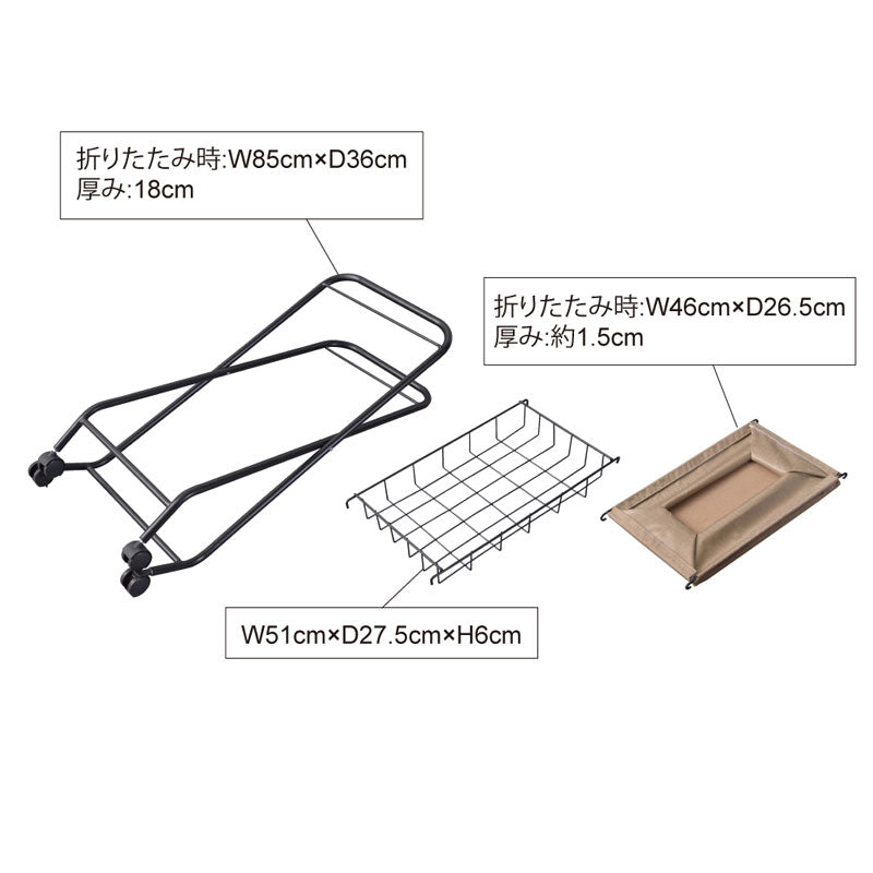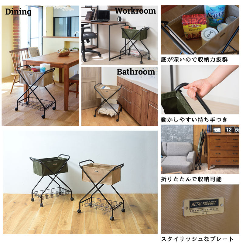 - 折りたたみが出来るバスケットワゴンです。 フレームを開いて下部棚、上部バスケットを取りつけるだけになります。 洗面はもちろん、ダイニング、デスクの横などにも利用が出来ます。 車に積み込みが出来るのでアウトドア商材として提案しても有りです。