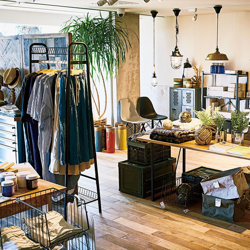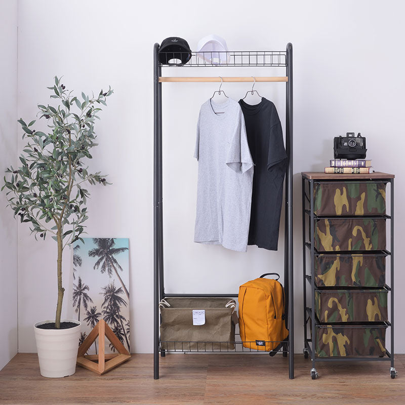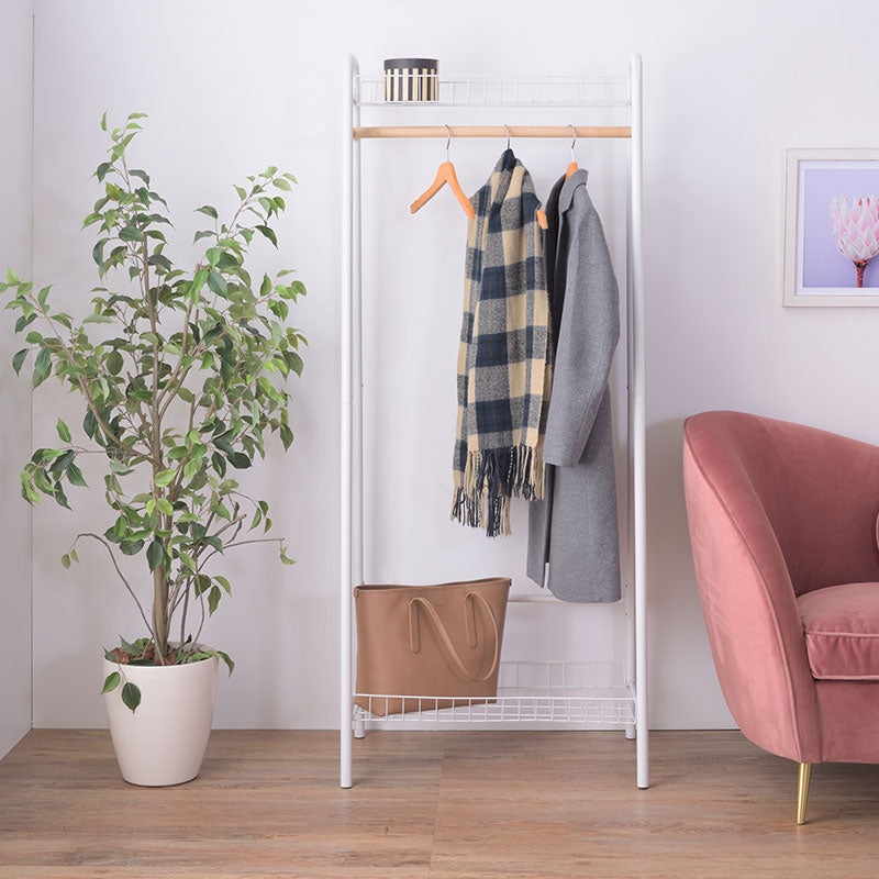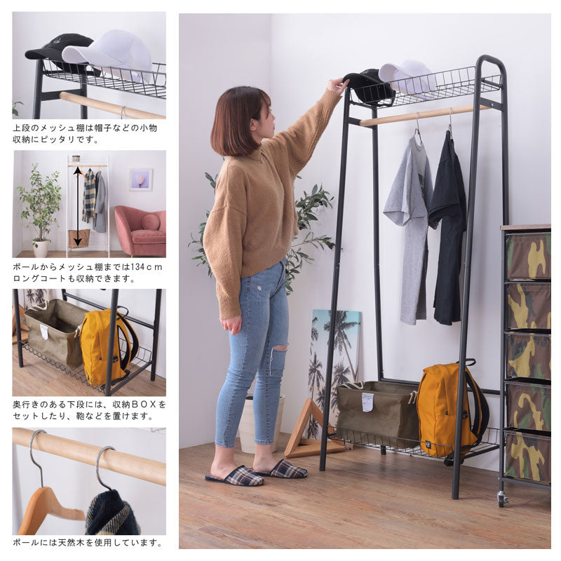 - メッシュ棚が上下2段についた、収納性抜群のハンガーラック。ポール部分には天然木を使用し、ショップディスプレイのようにオシャレに洋服を収納できます。