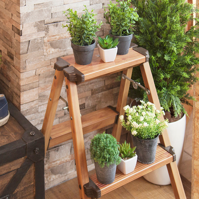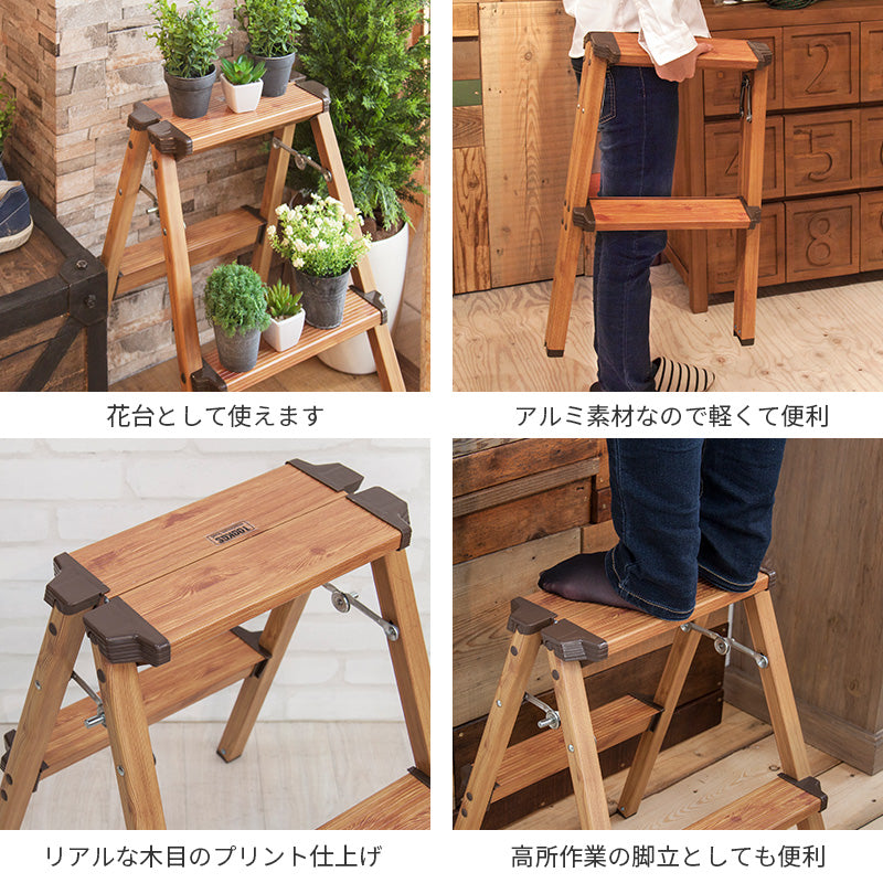 - お部屋のインテリアに溶け込む、アルミ素材のステップスツールです。 木目調の仕上げで飾りたくなるステップスツールです。脚立以外にも花台や、板を渡せばラックとしても、車の中に入れて洗車のときなど使い方によって様々なシーンで大活躍です。